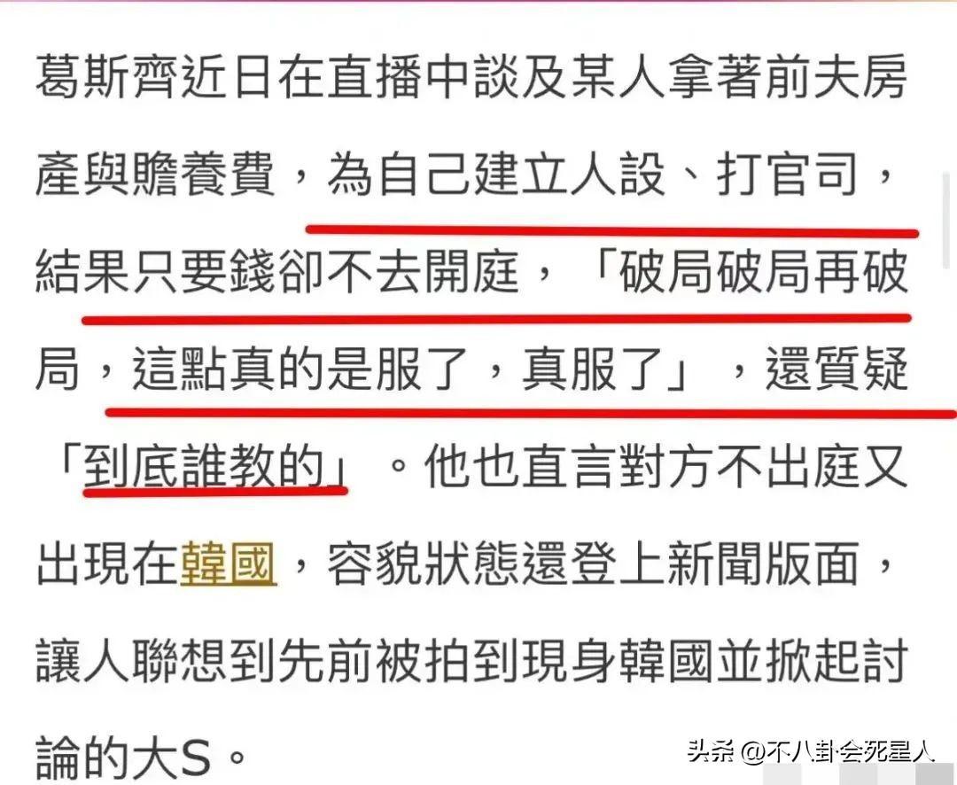 接下來,葛斯齊又開始給汪小菲說話,讓人不清楚他的想法。前幾天,葛斯齊替汪小菲發聲,稱大S一邊收下前夫的錢,一邊又不出庭,吐槽大S立人設。