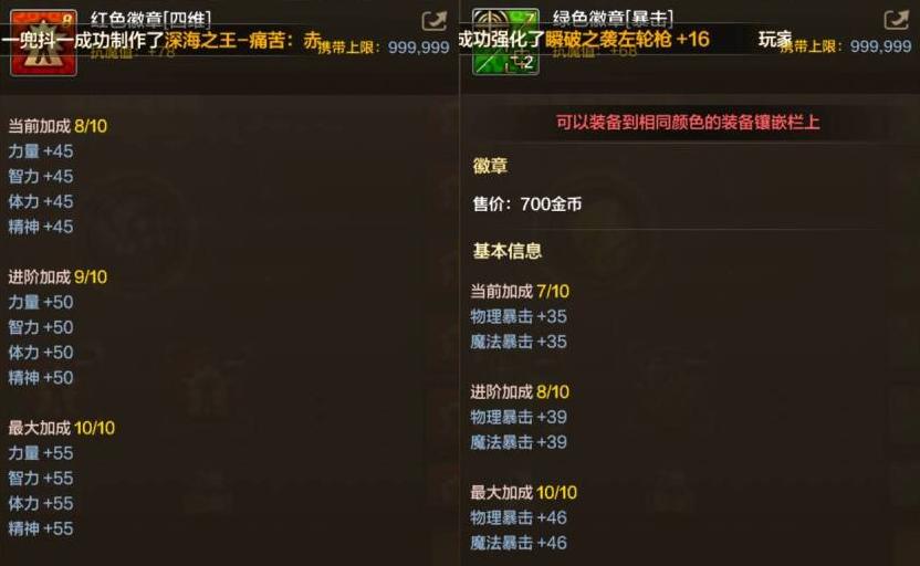 目前國服徽章最高級爲10級,紅色徽章可以提供55點四維,綠色徽章可以提供46點暴擊!