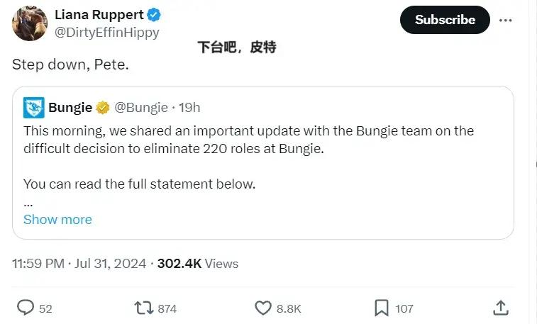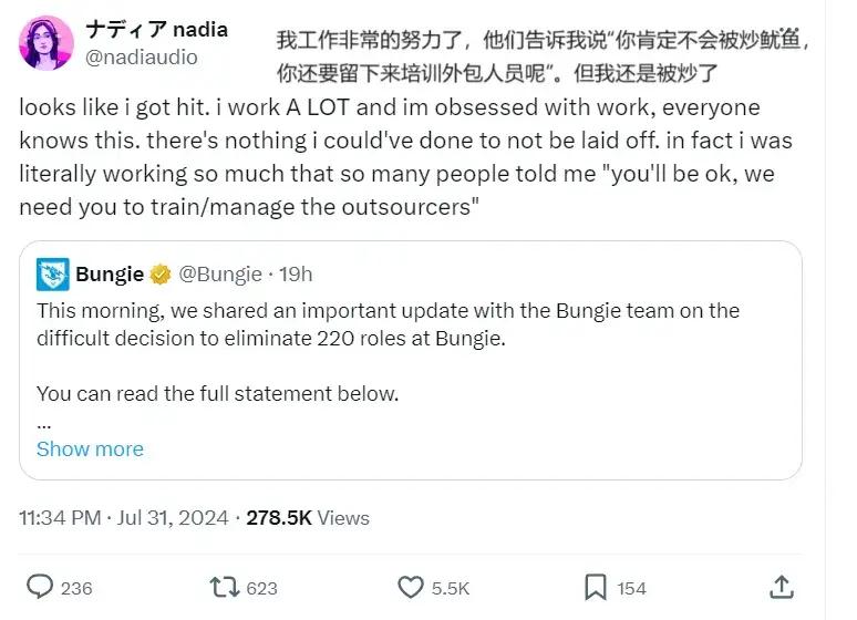 不過被Bungie裁員的員工們顯然沒有Pete Parsons這麼淡然了。官方X賬號公佈該消息後,評論區很多被解僱的員工們正在扎堆表達不滿,看起來這次裁員完全出乎他們預料。
