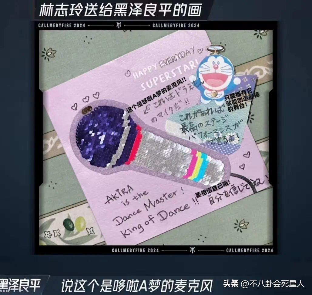 信裏畫了麥克風的油畫,旁邊還有機器貓,黑澤良平稱這就像施了魔法一樣,就會有信心。提到老婆林志玲,黑澤良平笑得合不攏嘴,肉眼可見的幸福。