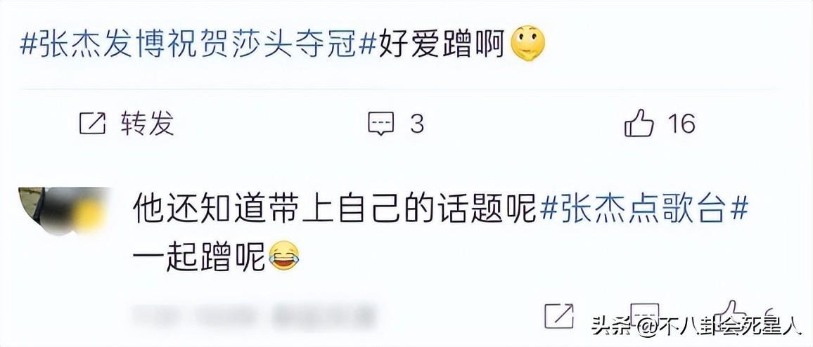張傑也被質疑蹭熱度了,起因是他發文祝賀莎頭奪冠,但是配了一個自己唱歌的視頻,並沒有配奧運冠軍的圖片。