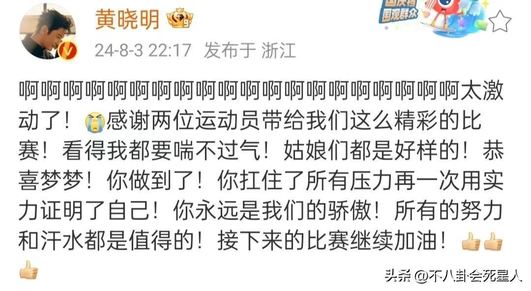 陳夢衛冕冠軍,瞬間引爆熱搜,受到了廣泛的關注,黃曉明第一時間發文祝賀,他說激動得喘不過氣,連續發了20個“啊”字,表示陳夢永遠是驕傲。
