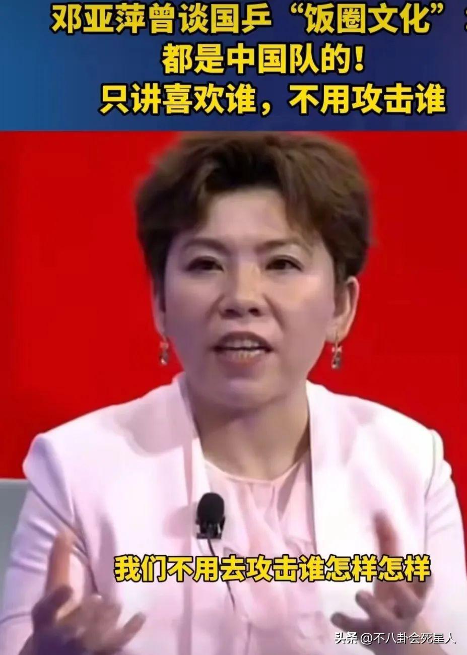 這裏不由得讓人想到了鄧亞萍之前說的話,提到“飯圈文化”,鄧亞萍說,“你可以因爲喜歡某個運動員,從而喜歡某項運動,體育本身是促進身心健康的,這其實是好事情,我們只管喜歡誰就好了,不用去攻擊誰,因爲都是中國隊的”。