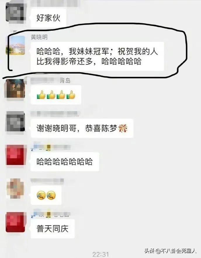 黃曉明非常高興,立即在羣裏發了100個紅包,笑稱他妹妹奪冠,祝賀他的人比他得影帝還多。