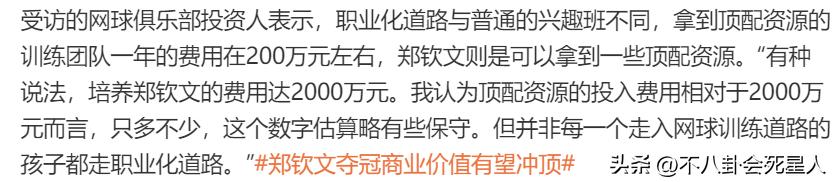 有業內預估,培養一個鄭欽文,背後的成本很可能超過2千萬,2千萬只是保守估計。因爲職業化道路和普通興趣班不同,像鄭欽文這種可以拿到頂配資源的訓練團隊一年花費在200萬左右。