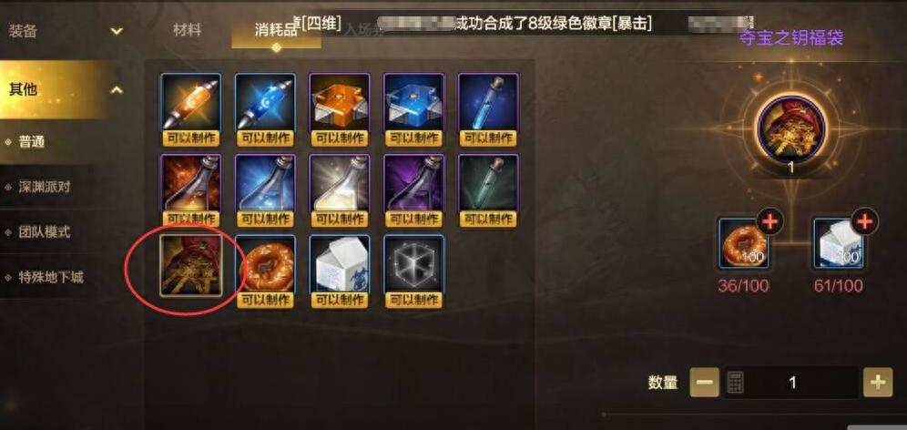 在“製作”系統中,找到「其他——消耗品——奪寶之鑰福袋」。