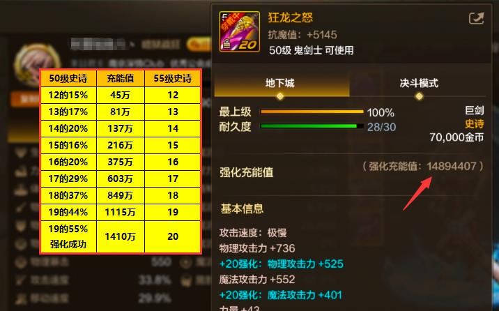 比如,當強化12時,充能值需要達到該階段的15%(45萬充能值),繼承到55團本史詩後才能依舊保留強化12;