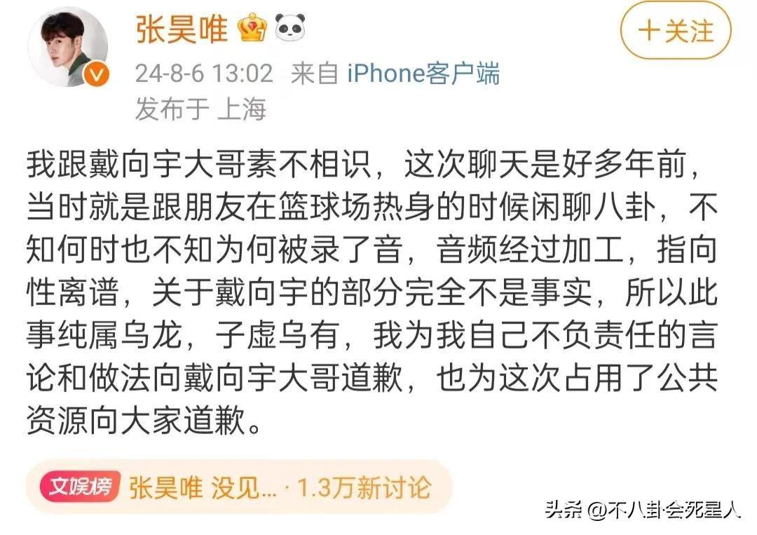 接着,張昊唯發文回應,表示他不認識戴向宇,這次聊天是多年前,他和朋友在籃球場熱身的時候閒聊,錄音是經過加工的,戴向宇的那部分完全是子虛烏有,他向戴向宇道歉,也抱歉佔用了公共資源。