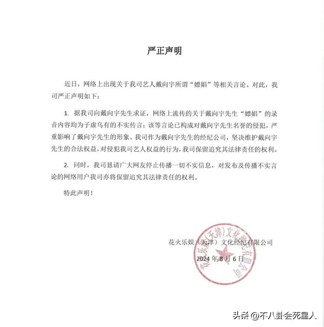 事情越鬧越大,戴向宇工作室終於發聲明回應,否認網傳的嫖娼,表示網傳的錄音內容都是不實的。