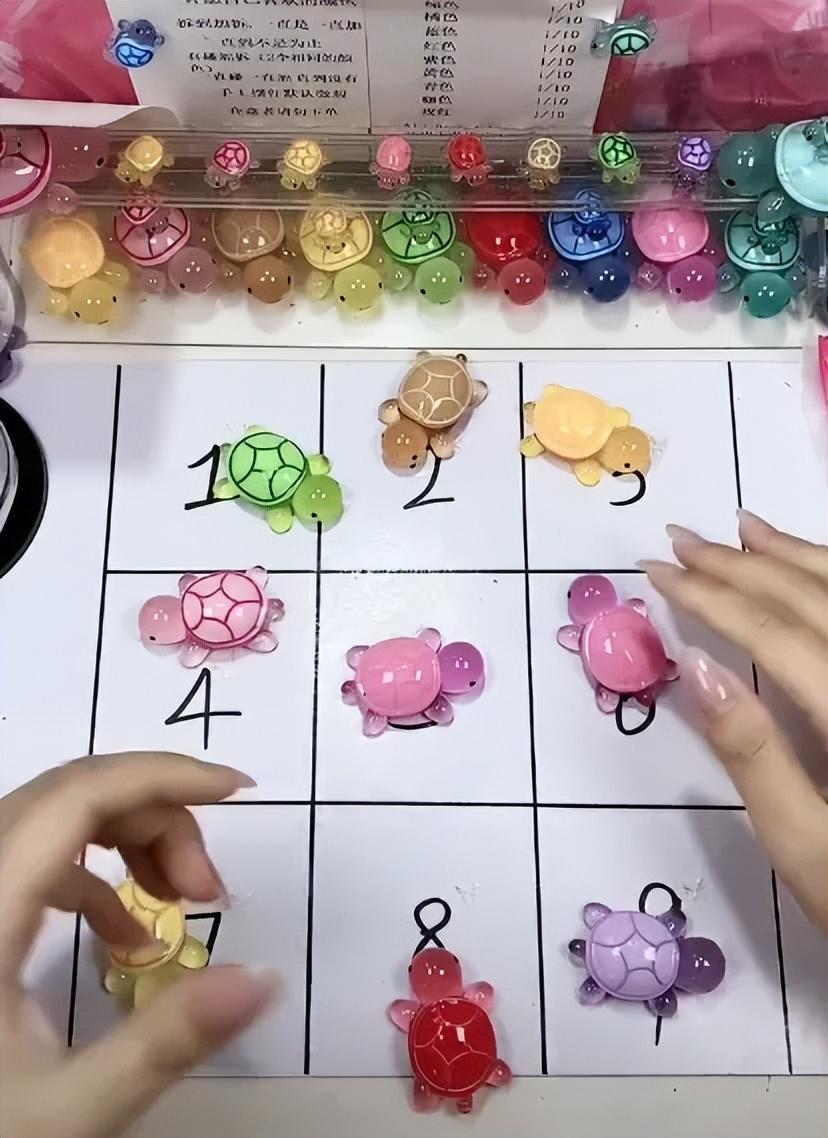 在鏡頭前方,桌子上放着一張畫有九宮格的白紙,每拆出一個烏龜,就把它放到其中1格里。填滿9格後,每出現一對相同顏色的烏龜,就把它們拿到一旁“消掉”,並再送一包;開出一條線上的3只同色,再送5包;九宮格湊齊全部9種顏色,也會送出5包。就這樣拆完所有購買和贈送後的烏龜盲盒後,開出的所有烏龜擺件都會打包寄給買家。