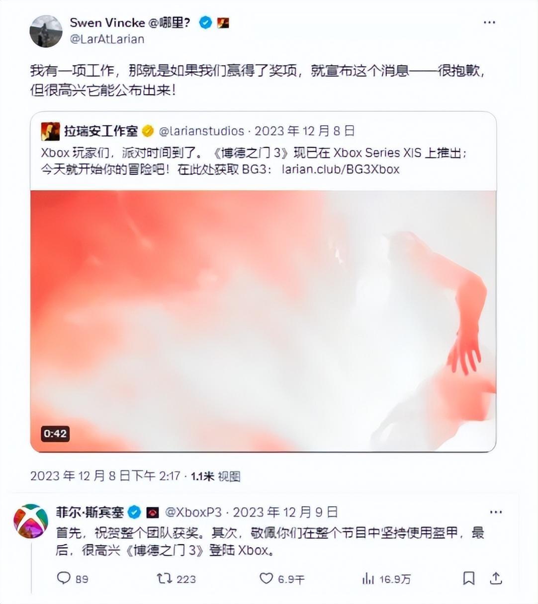 或許是《博德之門3》的優秀超乎微軟想象,微軟後來才和拉瑞安協商讓步——允許其開發的XSX和XSS版本在部分功能上有少許差異,遊戲這才趕在2023年末上架Xbox。此時2023年的TGA也恰好剛剛結束,拉瑞安工作室一度拿獎拿到手軟,Xbox玩家的《博德之門3》才姍姍來遲。