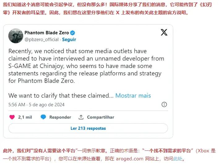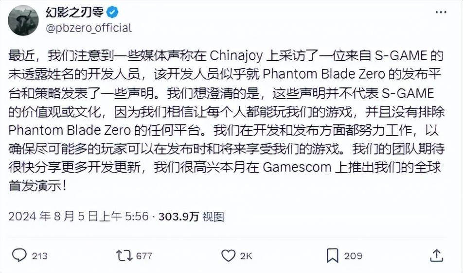 這段爭議性發言很快引起了國內外媒體關注,消息傳開後,《影之刃零》官方也下場澄清報道不實,表示沒有排除任何平臺,會努力讓儘可能多的玩家體驗到遊戲。