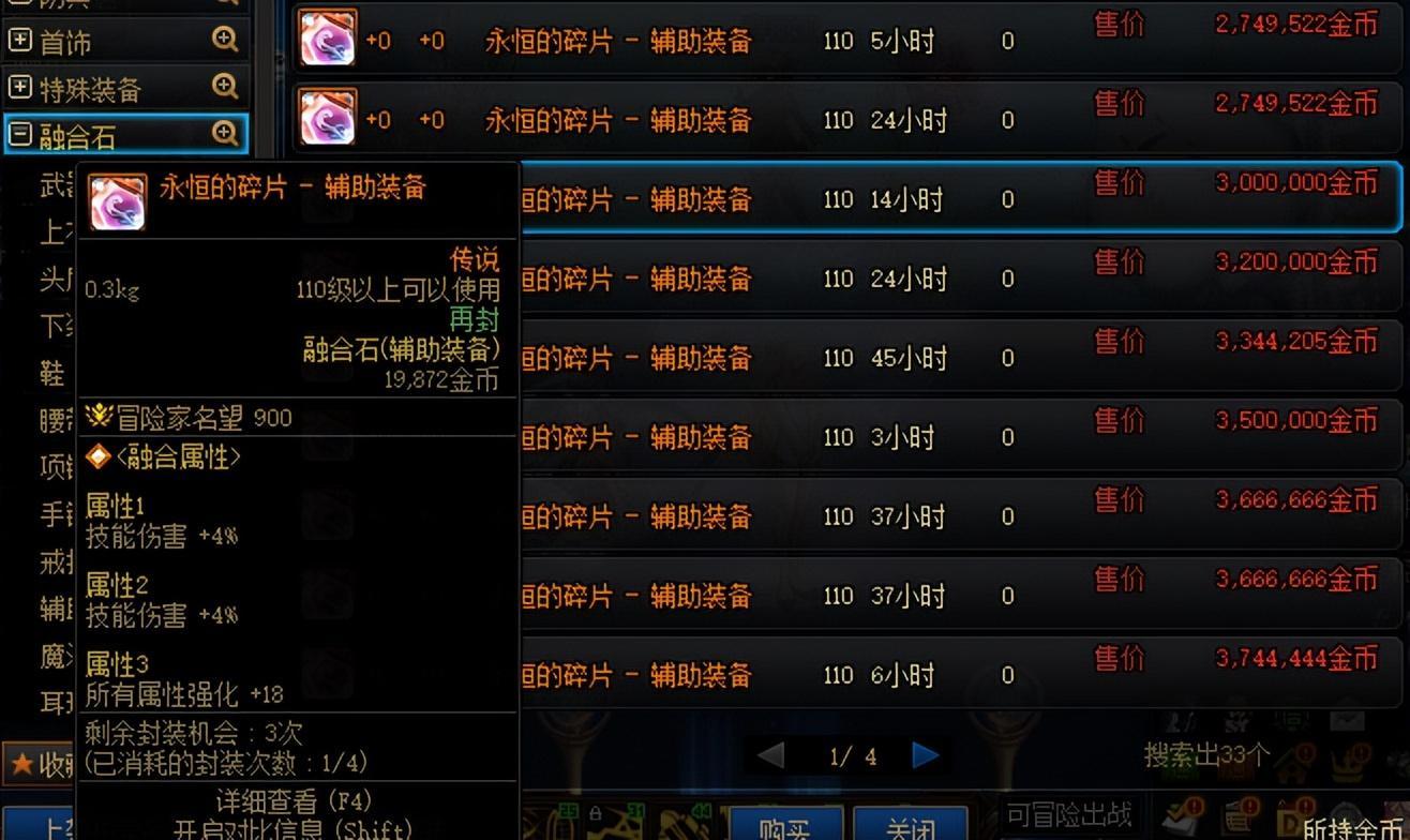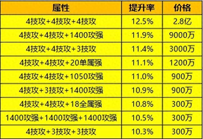 “4技攻*3”依舊是提升率最高的,一件12技攻融合石就有12.5%的提升,但是價格也一點兒沒有開玩笑,直接開到了2.8億金幣,屬實讓人望而生嘆了。