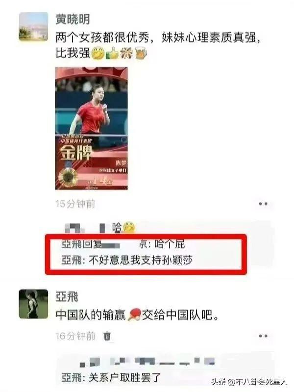 黃曉明和陳夢有親戚關係,算下來陳夢是黃曉明的表妹,她奪冠當晚,黃曉明難掩激動之情,各種發動態發紅包表示祝賀,卻被一個叫唐亞飛的人背刺。當初黃曉明幫唐亞飛宣傳品牌,沒想到她非但不感恩,還在黃曉明祝賀陳夢奪冠的動態下面爆粗口,表示她只支持孫穎莎。