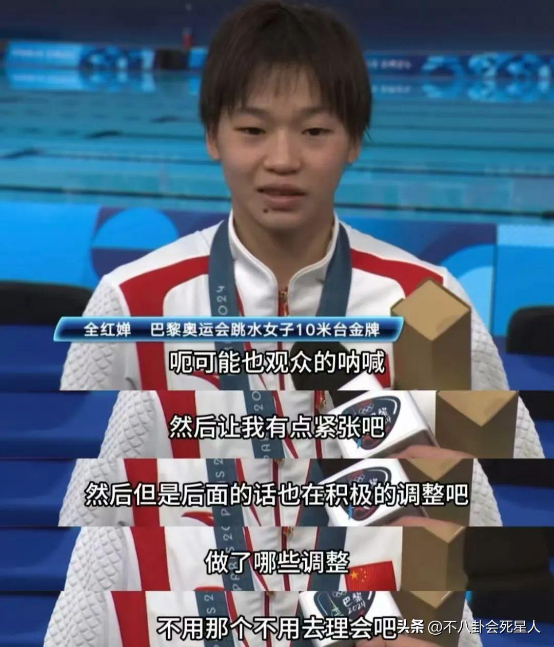 在第三跳的時候,全紅嬋出現了一點失誤,導致水花相對大了些,但她整體完成度還是很好,有記者採訪她如何看待這次失誤,全紅嬋表示可能是現場觀衆吶喊聲音有點大,所以對她的發揮產生了一定的影響,但是後面也在調整,不用理會專注自己。