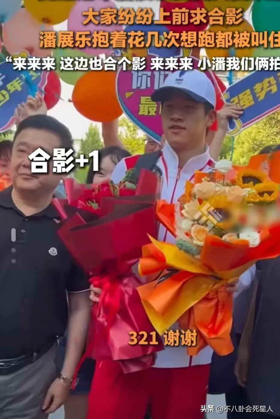 潘展樂走紅後,社交賬號漲粉超過百萬,他回國後大受歡迎,被各種拉來拍照,合影鮮花不間斷,成爲大家追捧的偶像。