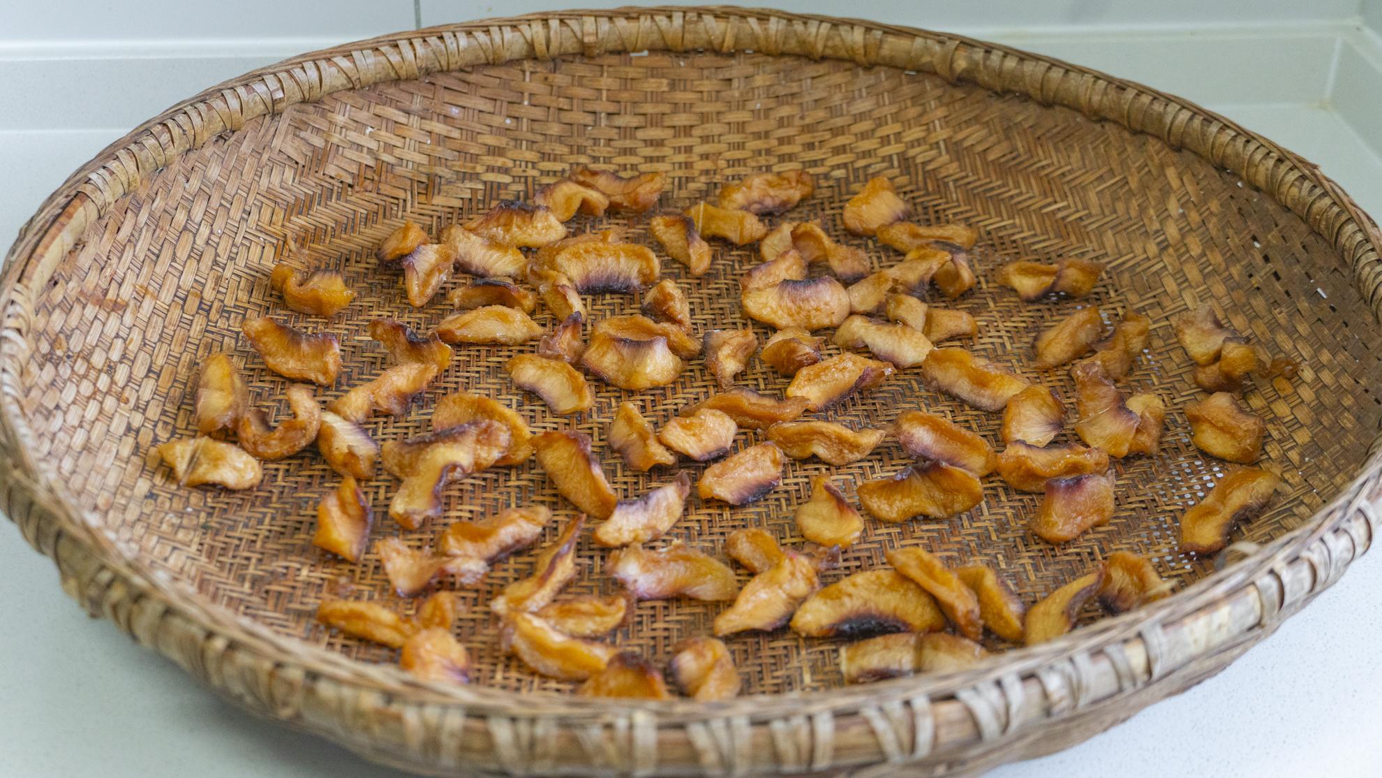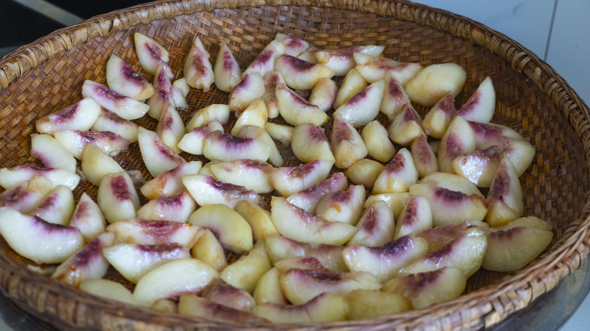 第七步:桃子煮好後關火,把桃子一個個夾出來放到簸箕裏面晾曬,太陽大的話最多兩三天。