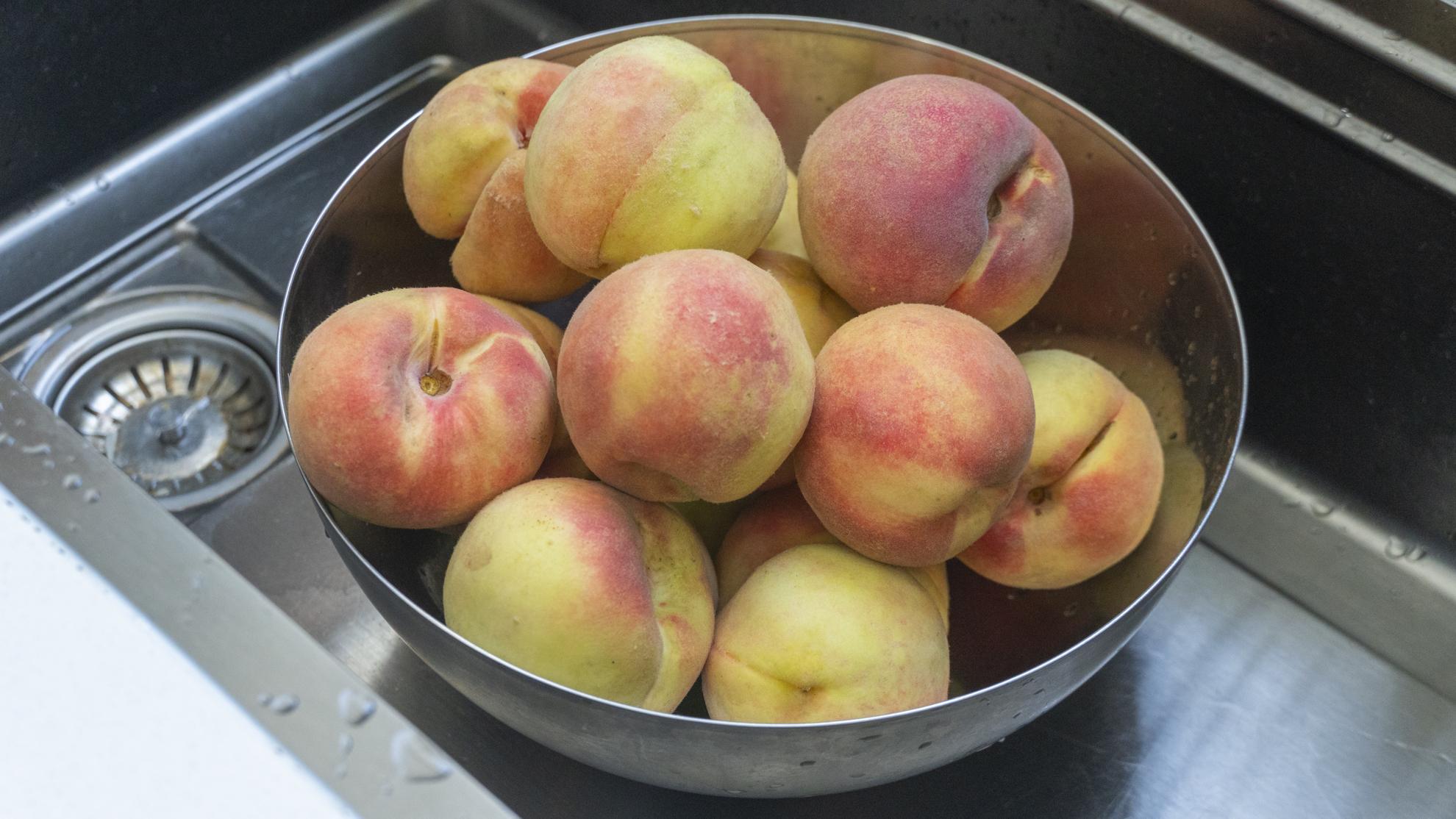 第一步:桃子8斤,這清洗乾淨。桃子我用的是水蜜桃,大家也可以用黃桃,做出來顏色會更好看哦!清水先搓洗一遍,或者加點鹽一個個搓洗都行。