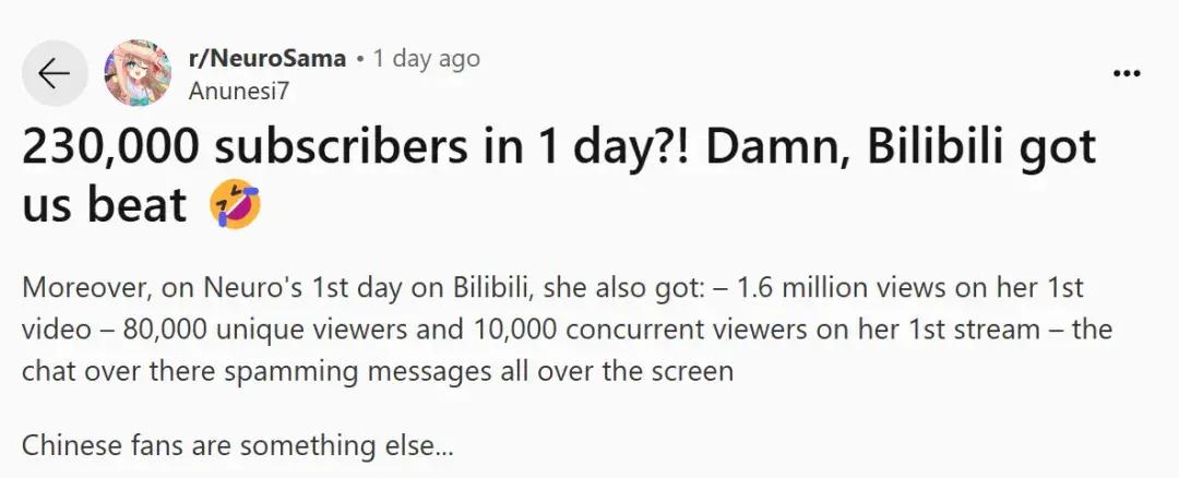 此前Neuro的主力直播平臺是Twitch,主要通過英語與觀衆互動,再加上她的直播風格相較於傳統的日V和目前的國V差別較大,因此Neuro的人氣在國內只能算是不溫不火,很多人都聽說過,但關注的人確實不多——直到她正式入駐B站的那一天。