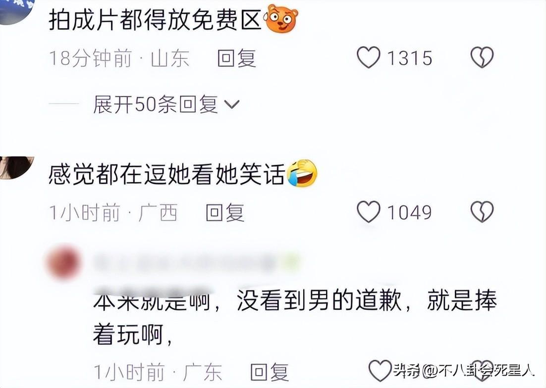 有人說要是拍成片,都得放免費區,更有人指出,在場圍觀的人都是在逗她看她笑話,那個道歉的男生就是故意捧着玩。