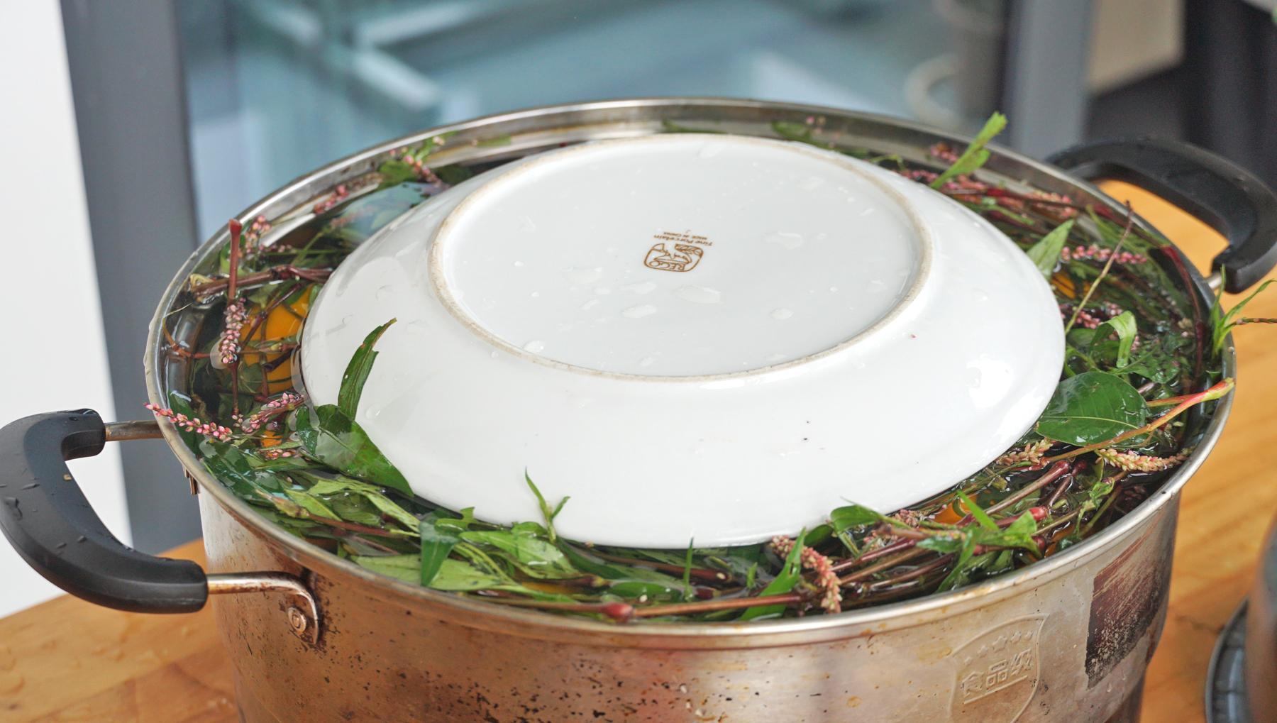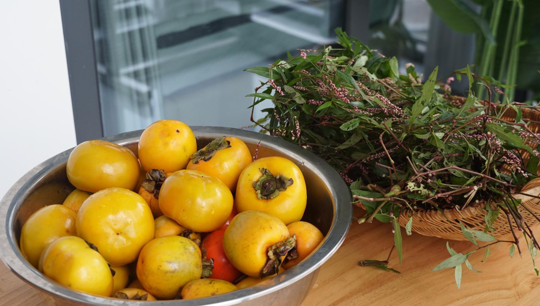 4、我準備了一個大蒸鍋,一層辣蓼草一層柿子的擺放。