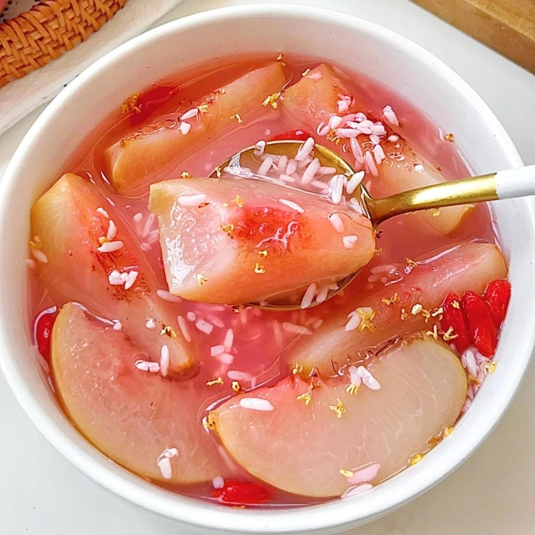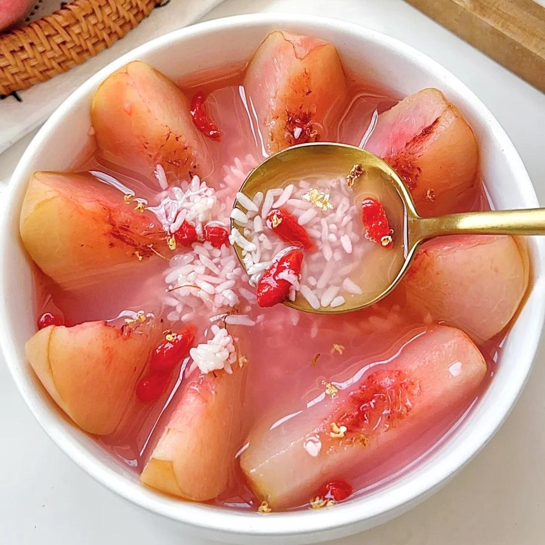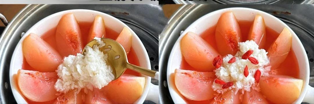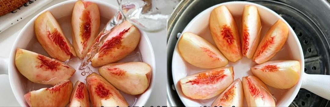 4、最後再倒入酒釀蒸2分鐘即可,蒸熟的桃肉軟糯好喫,湯汁的甘甜搭配着酒釀的醇香,二者搭配補氣血的效果更強了,又不容易滋膩。