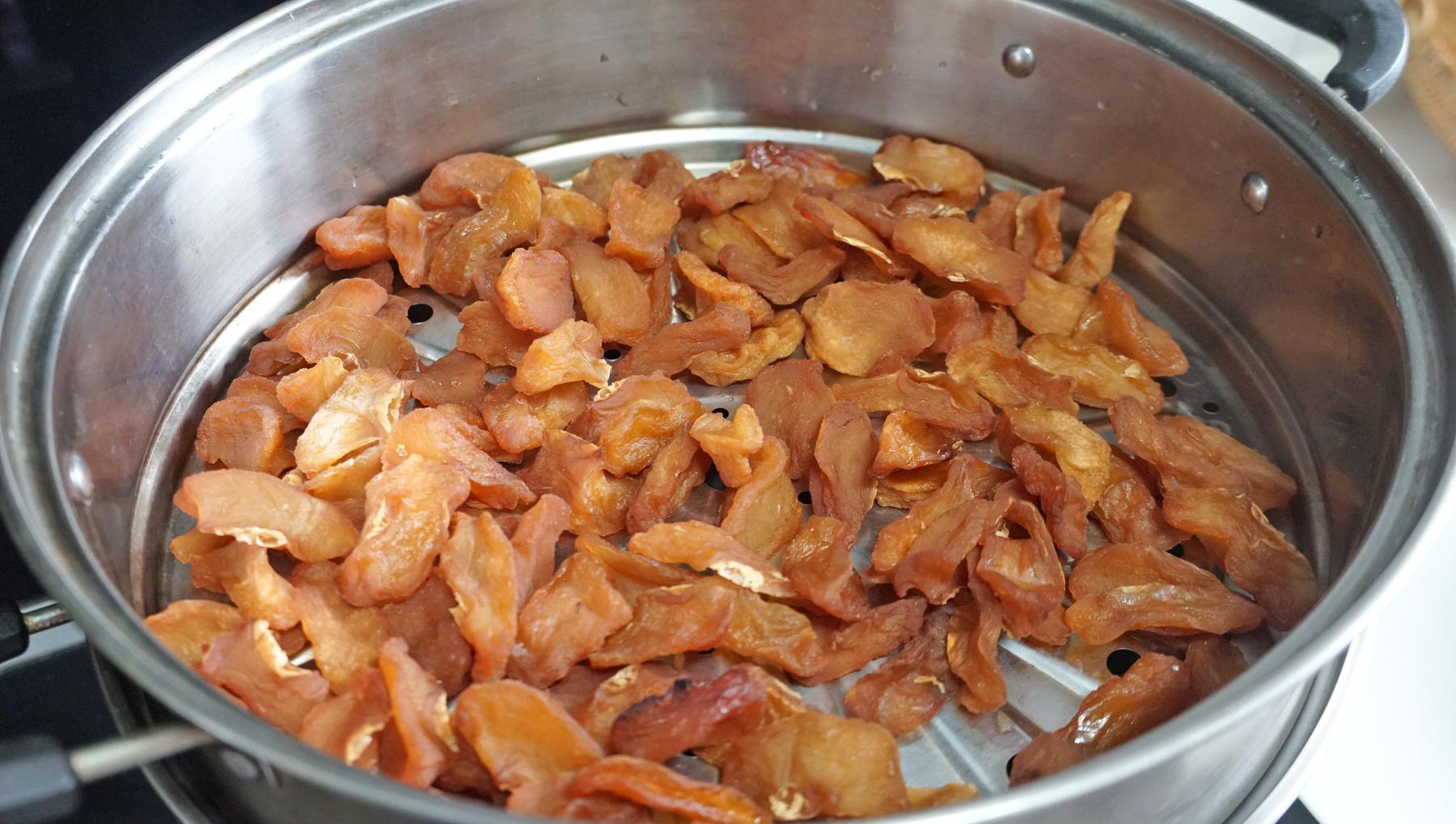 3、碗里加入兩調羹水,和桃皮一起蒸,通氣活血作用更好。