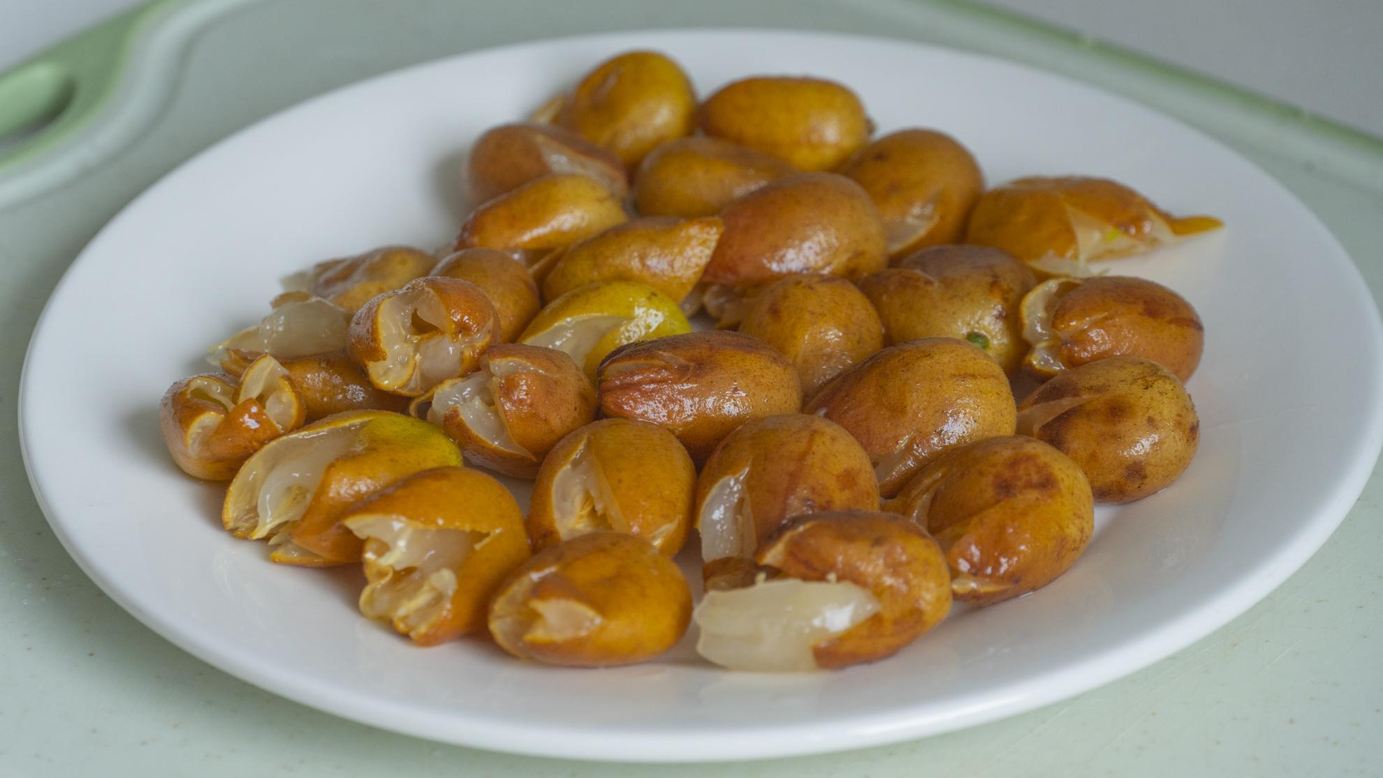 第二步:洗好的黃皮用剪刀剪個十字口,然後擠出裏面的籽,剪一下更容易煮出味道。