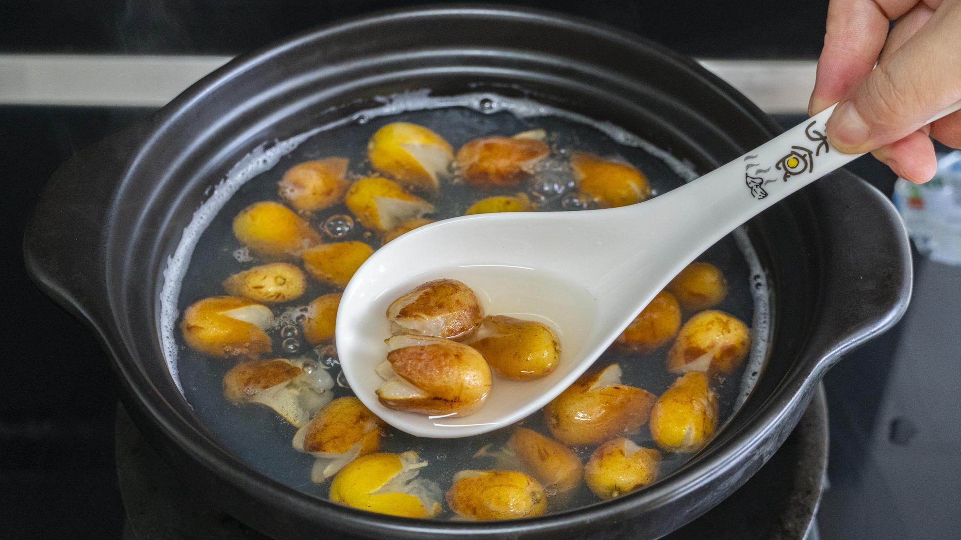 第四步:砂鍋燒水,把黃皮果倒進來煮,蓋上先煮10分鐘,把黃皮果的味道先煮出來。