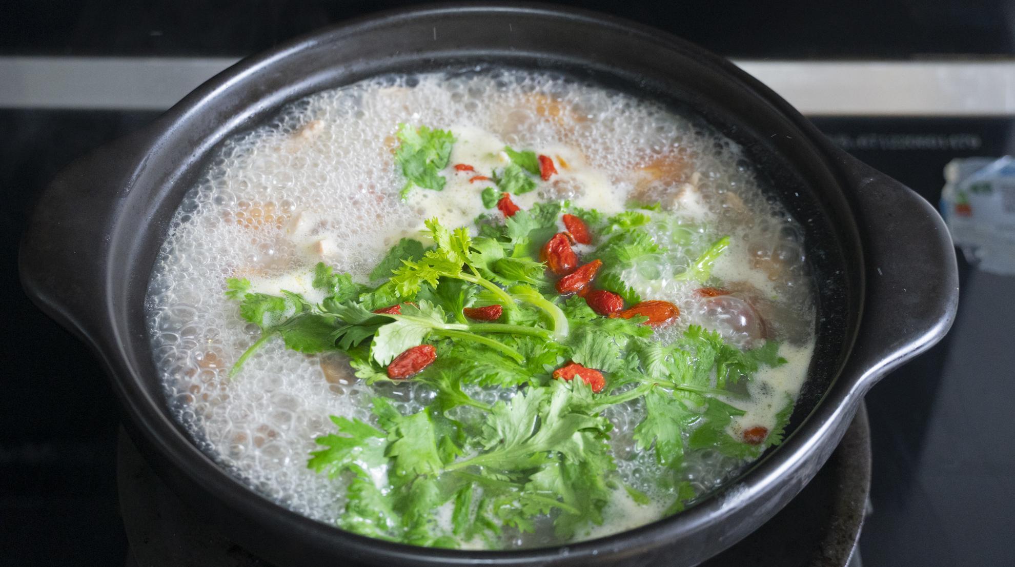 第六步:肉片變色就是熟了,然後加點枸杞和香菜,調味加點鹽和雞精,這個湯就做好了。