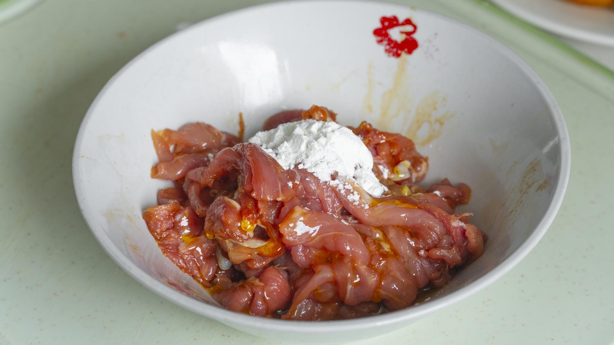 第三步:瘦肉洗乾淨後切片,然後稍微的醃了20分鐘。調味加的鹽、胡椒粉、一點點的生抽和蠔油,最後加了一點的生粉和食用油抓勻。
