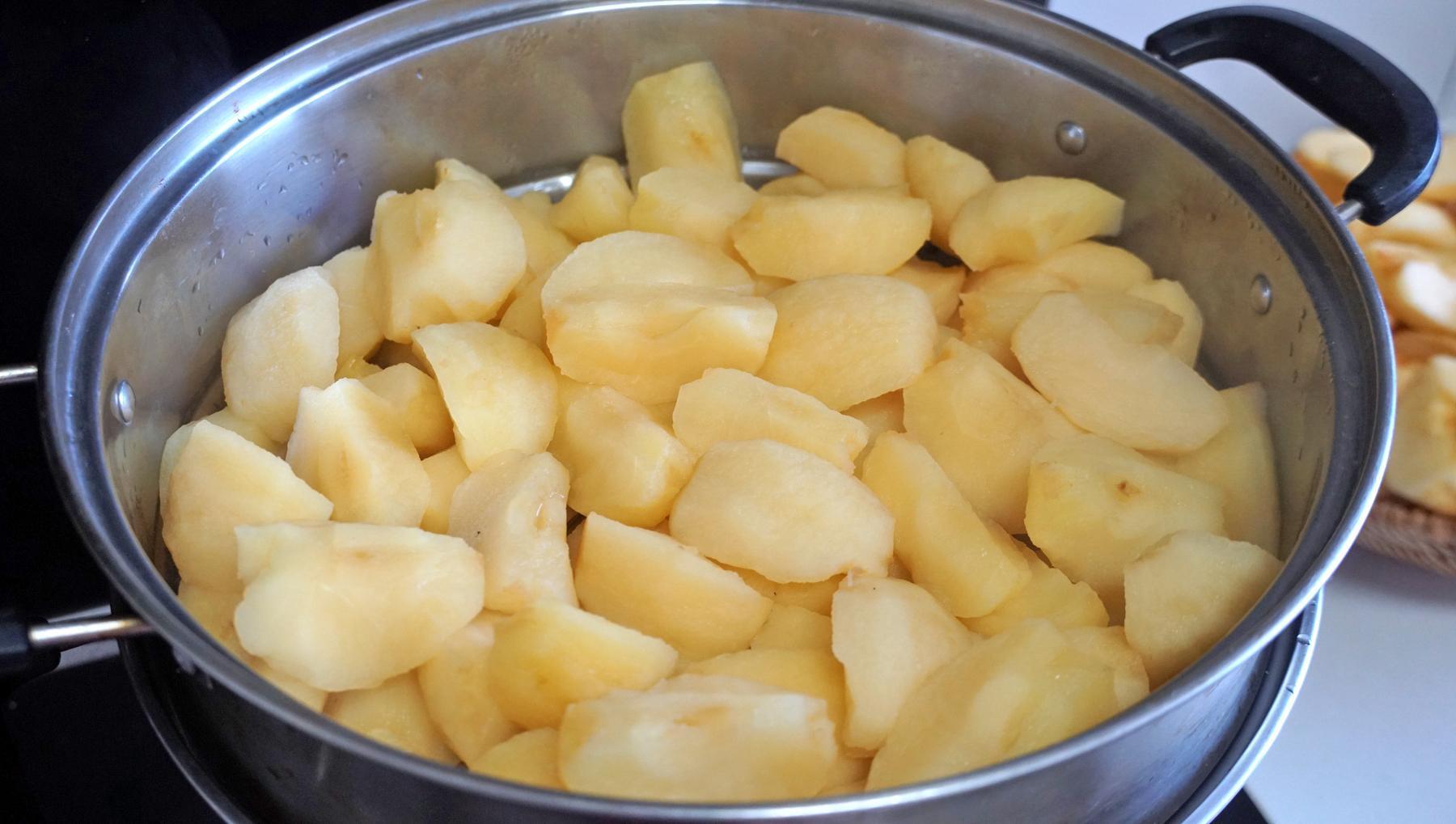3、全部切好裝入盆裏,開始上鍋蒸,水開蒸30分鐘,把蘋果全部蒸熟。