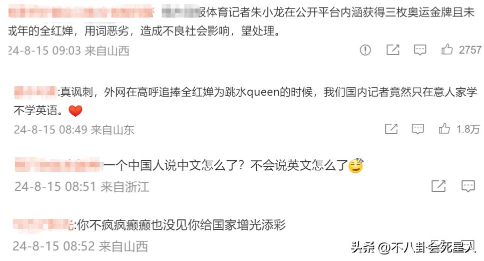 很多網友們覺得這位體育記者的言語侮辱了爲國爭光的奧運冠軍,並希望有關部門可以處理他。有網友反問,全紅嬋是中國運動員爲什麼要她學英文,這位記者說別人瘋瘋癲癲,但自以爲“正常”的他有對國家增彩嗎?