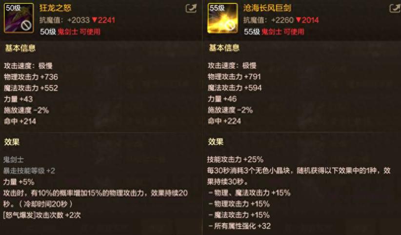 滄海武器多了物攻和技攻,而狂龍之怒則是多了力量和麪板,看了半天才發現,原來這位兄弟直接把滄海武器的“隨機屬性”給忽略了,所以得出滄海不如狂龍之怒的結論。