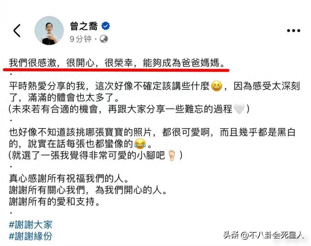 8月15日,知名演員曾之喬發文表示很感激、很開心、很榮幸能當爸爸媽媽。正式官宣她懷孕的好消息,感謝所有的愛和支持。