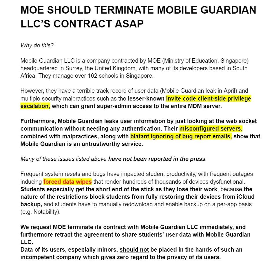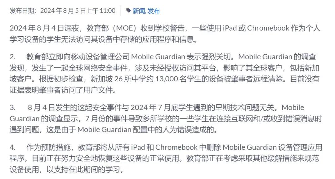 學生們向學校求助,各地學校又上報教育部,8月5日新加坡教育部發布公告,稱學生設備中的Mobile Guardian——一款兼顧教學和監管學生的軟件遭黑客入侵,造成約13000名學生的設備被清空,其中包括學生們的電子課堂作業和學習筆記。
