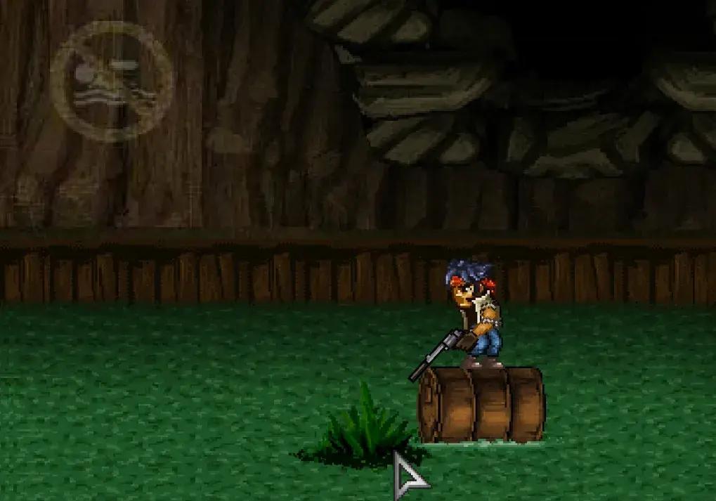 第二關有處水池,泛着不祥的綠光,落入即死。一個站在油桶上的日軍狙擊手會朝腳下的水面射擊,用水流推動油桶。這是一個攻關提示——玩家也可以射擊水面讓油桶飄過來,再跳上油桶朝腳下射擊渡到對岸。