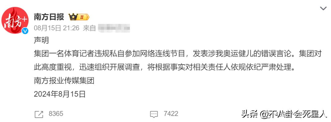 根據最新消息,某日報已經發出聲明,稱該記者是違規私自網絡連線,而且涉及對奧運健兒有錯誤言論,他們會組織展開調查,依規對該記者進行嚴肅處理。