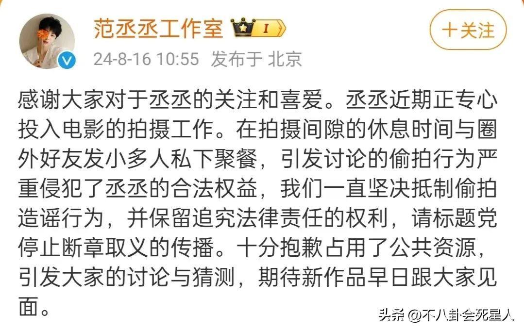 輿論持續發酵,範丞丞工作室發文闢謠,表示範丞丞正在專心投入電影拍攝工作,在拍攝間隙休息時間與圈外好友發小聚餐,否認戀情傳聞。