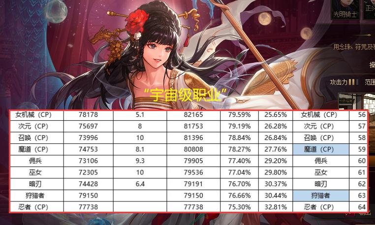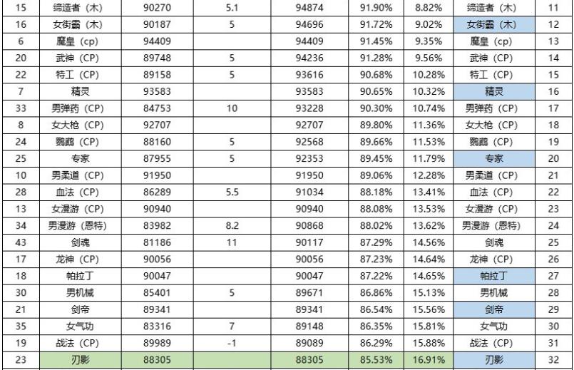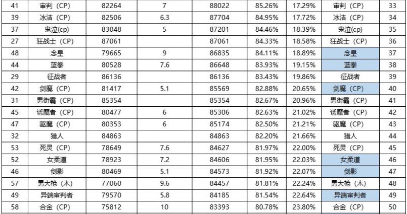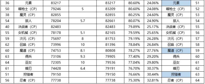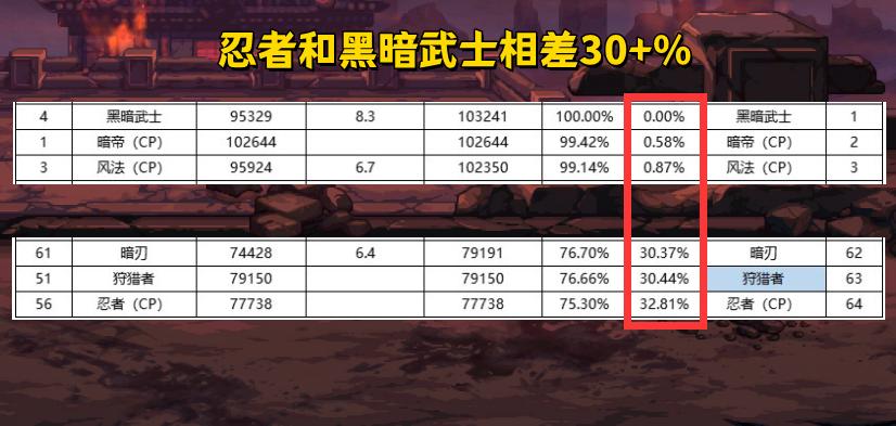 而且這並不是特例,差距30%以上的職業,有暗刃、狩獵者、忍者;