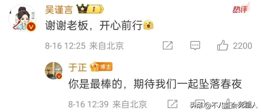 繼續說回吳謹言,看到老闆的留言和讚賞,她表達了感謝,於正的回覆評價很高,他認爲吳謹言是最棒的。