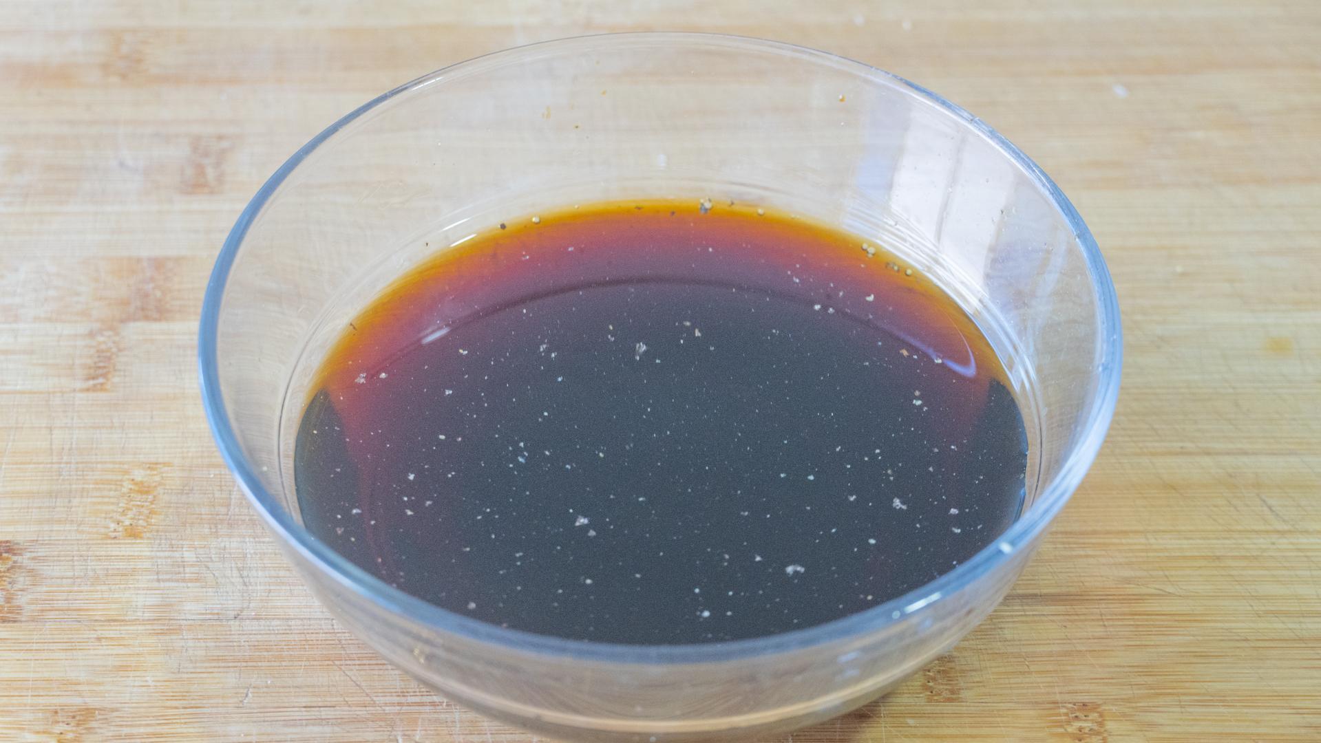 3、接着我們來調個醬汁:加兩勺生抽、一勺老抽、一勺蠔油、一勺料酒、半勺糖、少許雞精、半碗清水,攪拌均勻就可以了。