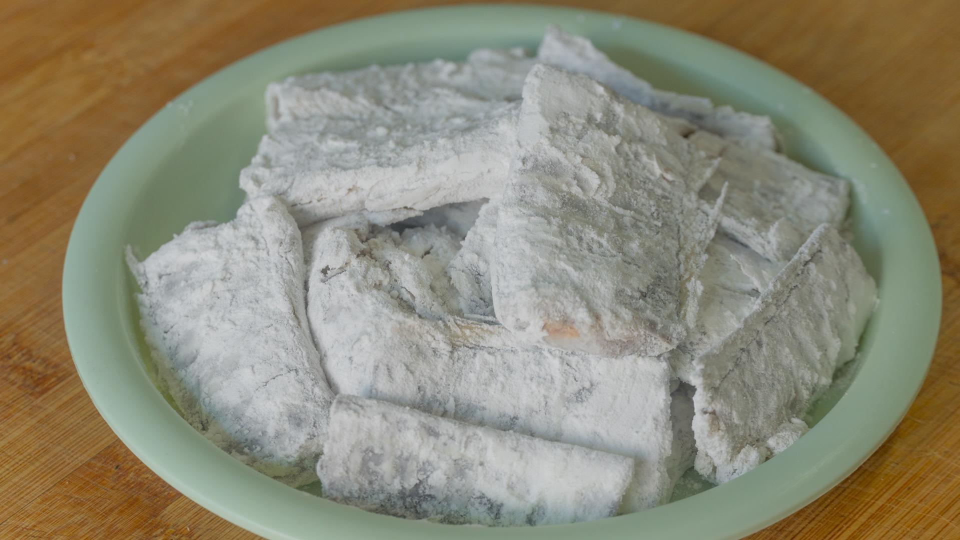 4、帶魚醃好後取出來,用廚用紙巾吸乾帶魚表面的水份。接着準備兩勺玉米澱粉,把帶魚放進來,裹上薄薄一層澱粉,再把表面多餘的粉拍掉。