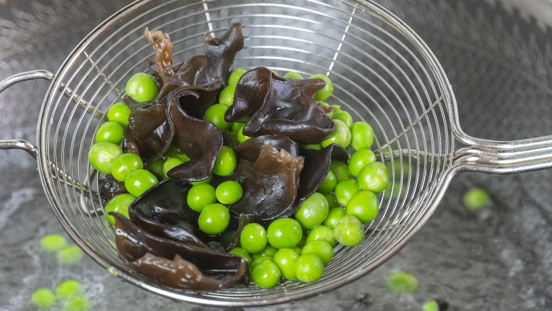 4、起鍋燒水,水開加一勺鹽和一勺食用油,接着依次把青豆、木耳倒進來焯水。大火1分鐘後撈出來晾乾水分。