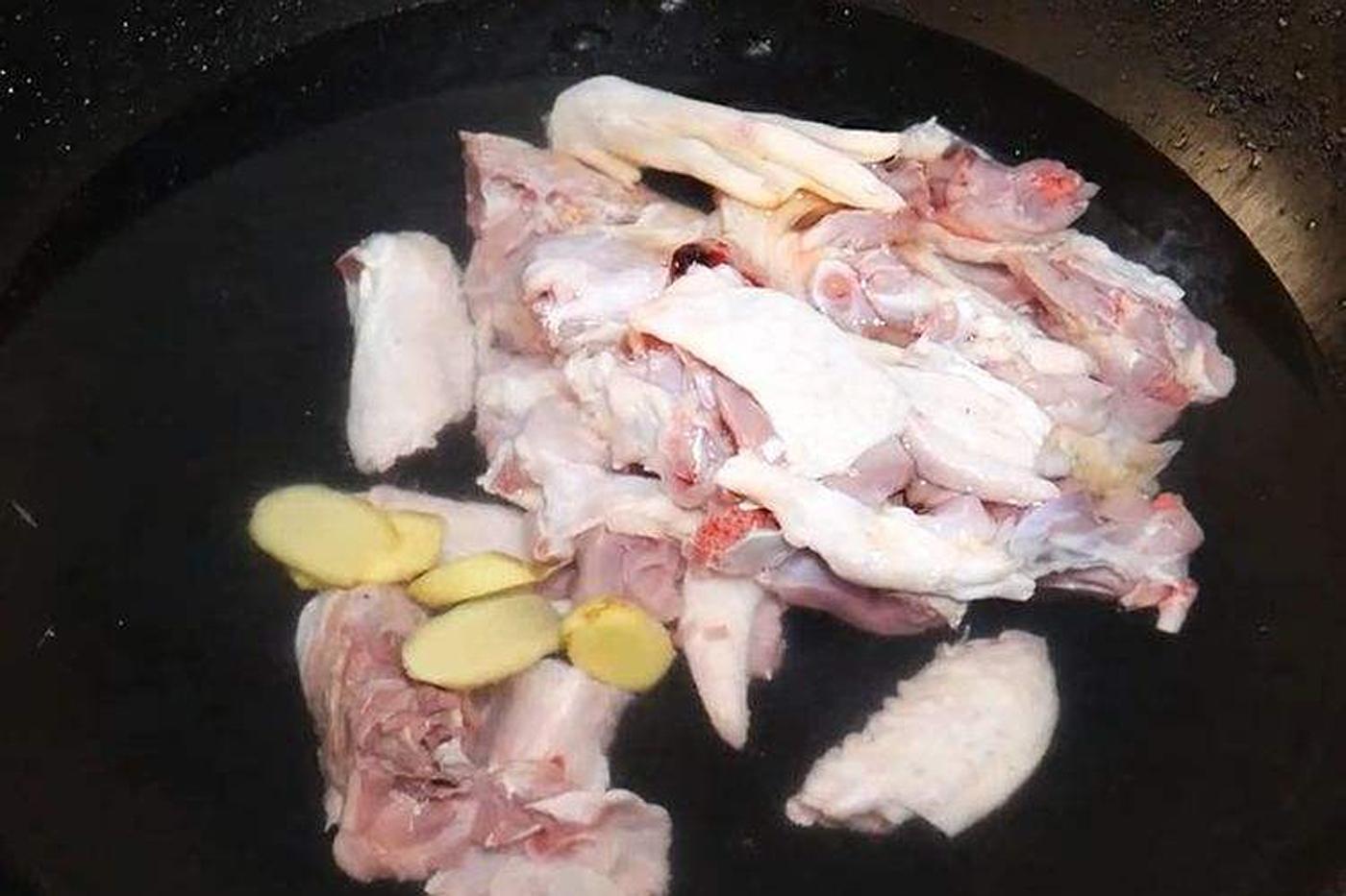 1、肉鴨切小塊放入冷水中,加2片老薑、2勺料酒大火煮開,焯去鴨骨頭裏面的血水後撈出;