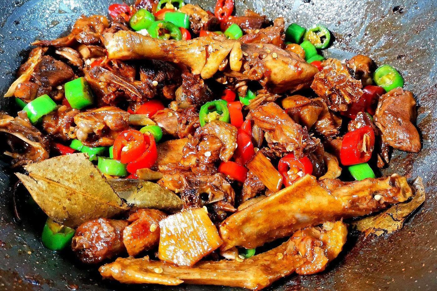 2、鍋中水倒掉燒熱,放半勺植物油,然後放入八角、老薑、大蔥和鮮香提味的剁椒醬炒香,再倒入鴨肉翻炒均勻,淋入一勺生抽、一勺老抽翻炒上色;