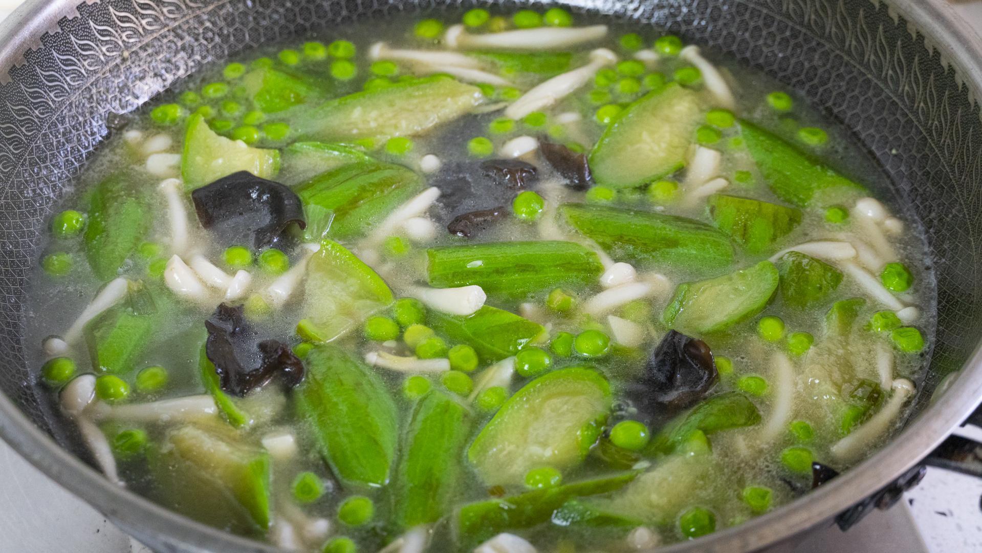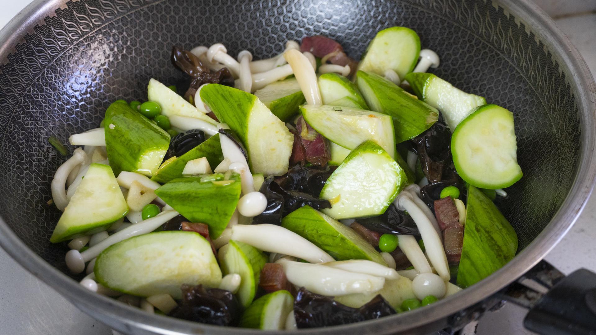 6、炒出油脂和香味兒後倒入絲瓜、青豆、木耳、白玉菇,翻均勻。