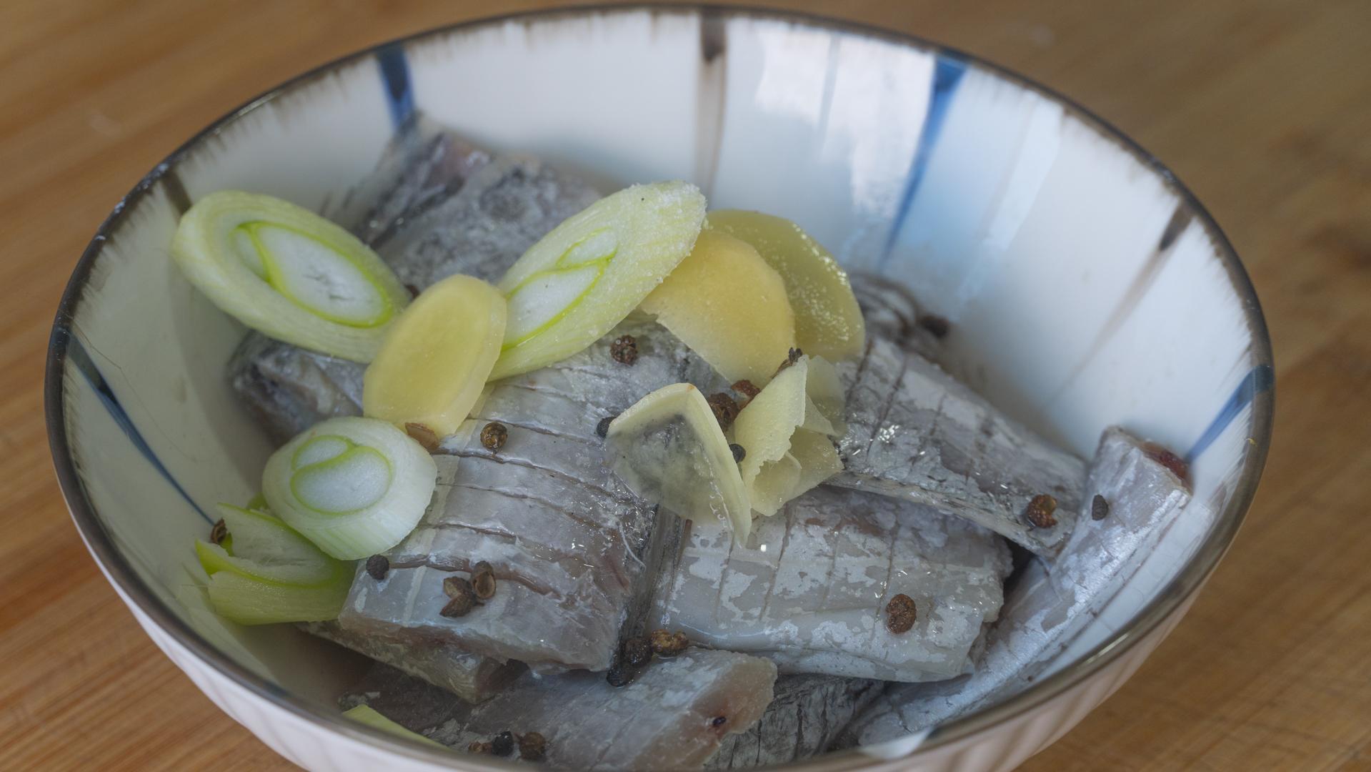 1、帶魚段1斤,加水清洗乾淨,然後瀝乾水分,兩面打上花刀,然後再切小段,大蔥和生薑分別切片,然後和帶魚裝一起,再來一小把花椒,一勺鹽一大勺料酒,抓拌均勻後醃製30分鐘。