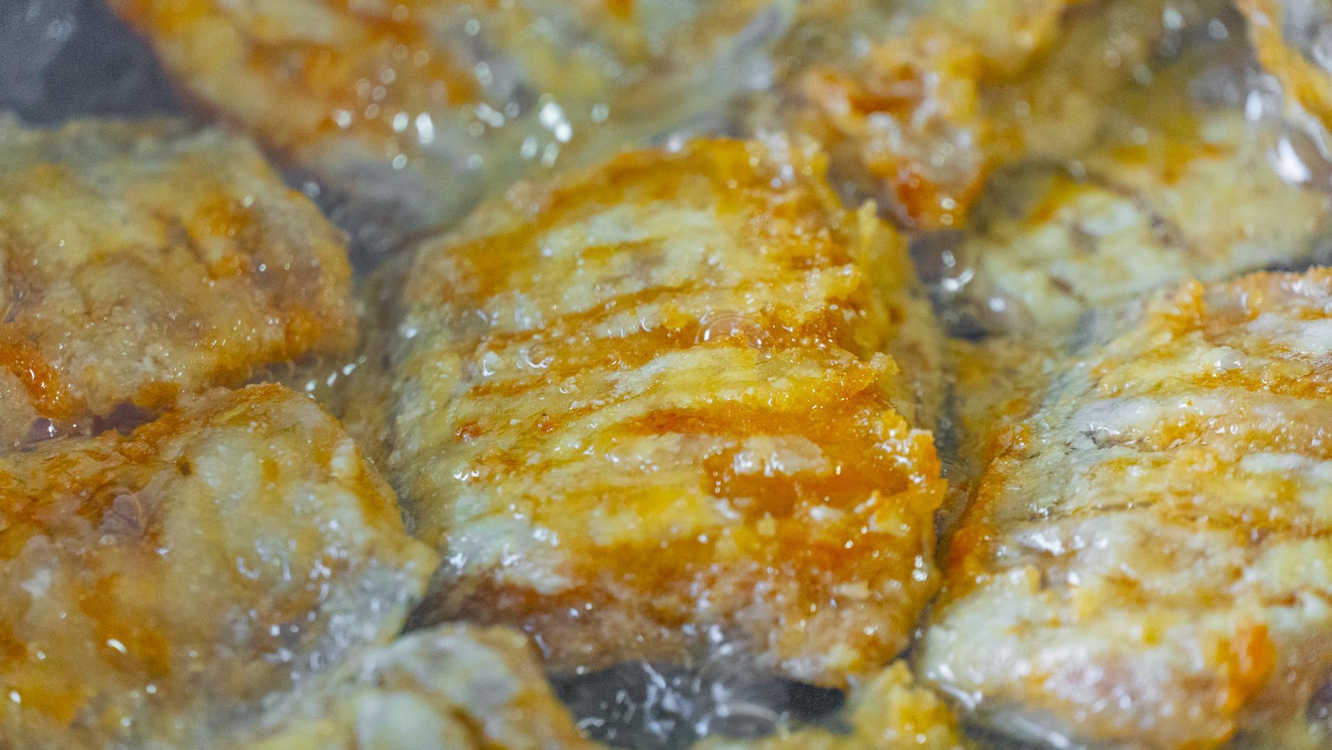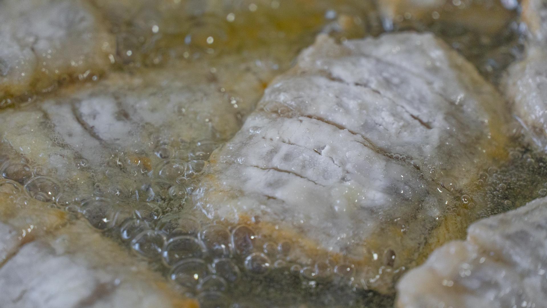 5、全部裹好後起鍋倒油,適量的多倒一些,油溫6成熱下入帶魚炸。