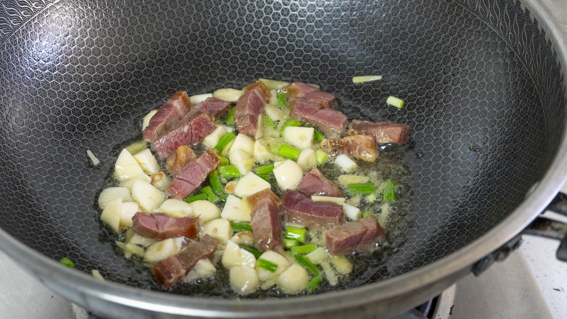 5、起鍋熱油,油熱下蔥薑蒜爆香,然後下火腿翻炒。